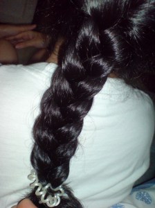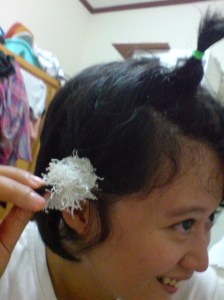Bah, saking pendeknya, ikat rambut yang putih menutupi hasil kepangan. Dan kepangan dengan karet hijau membuat gw terlihat seperti Upin. fuh…. 😐